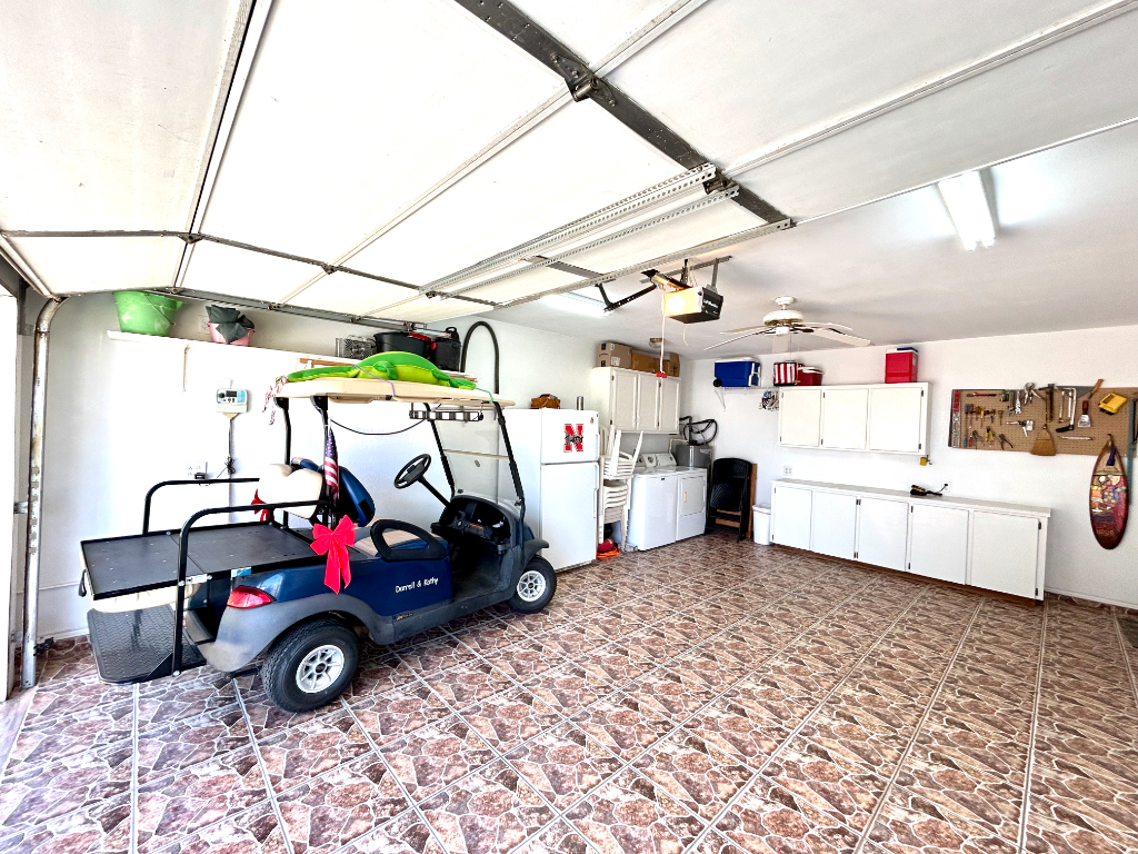 The tiled floor 2-car garage has plenty of storage, 2nd refrigerator & ceiling fan.