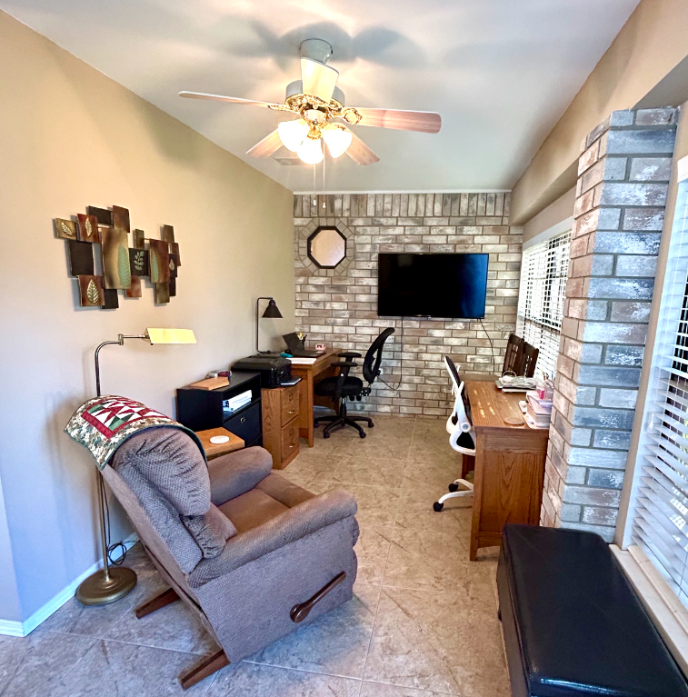 Three vaulted ceilings and ceiling fans throughout. Most furniture stays with house, including bedroom furniture (includes King and Queen beds). Office contains two oak desks, recliner, ottoman, shelving, file cabinet, and 50” TV. Living room contains all leather recliners, couch & love seat, end tables, lamps, rugs, and 58” TV. Kitchen table (with leaf) and 4 chairs included.